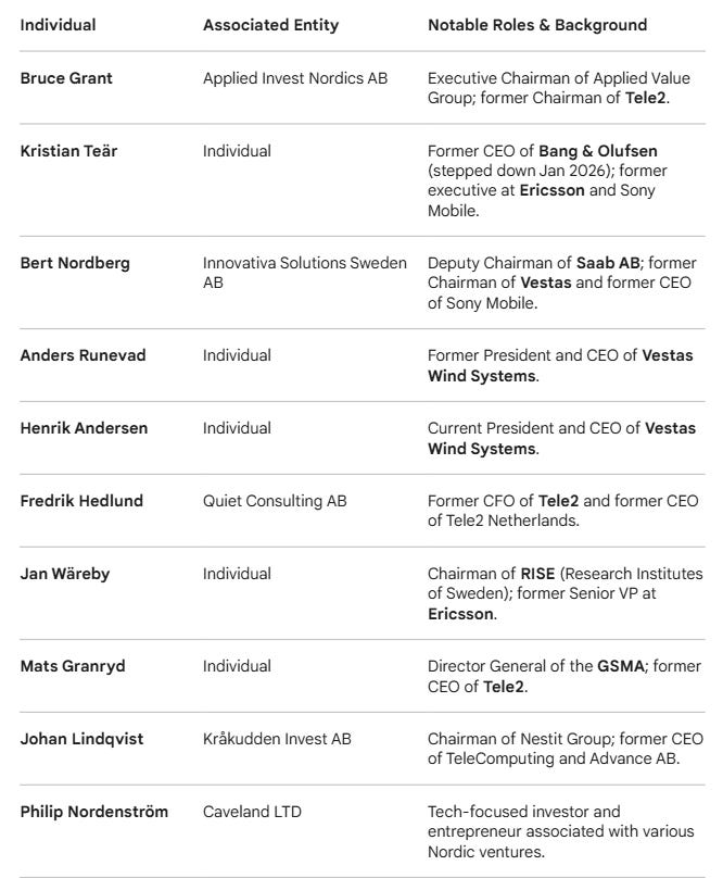 The issue was led by Applied Invest Nordics AB, the family office of Bruce Grant. For those who don’t know, Grant was the Chairman of Tele2 and worked with Jan Stenbeck, one of Sweden’s wealthiest people, who earned their money in the telecom and media industry. Other investors who joined include industry veterans like Kristian Teär and Bert Nordberg. (Full list of investors & their roles at the end of the write-up)